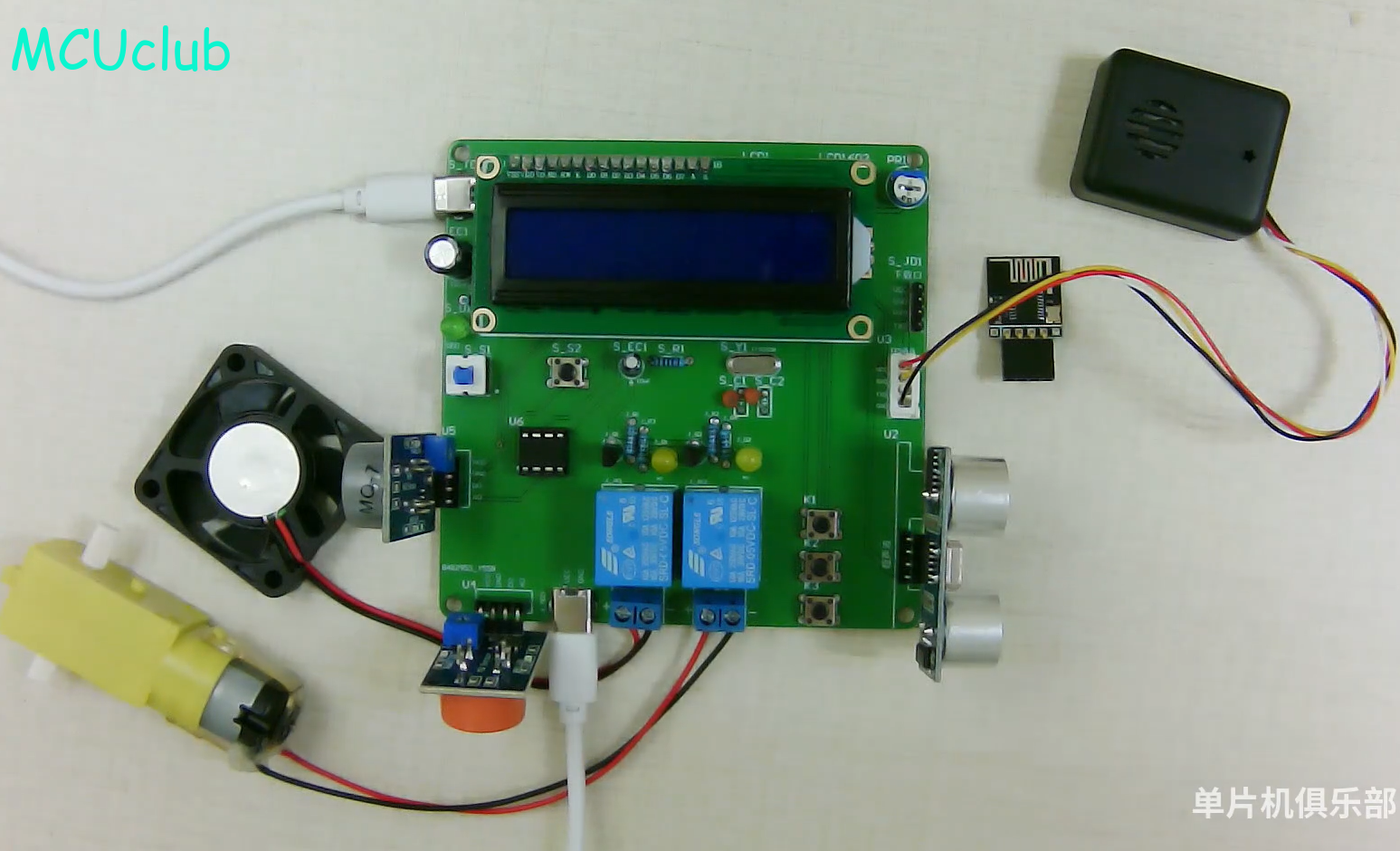 1、通超声波检测前方障碍物,当检测到障碍物距离小于100cm大于50cm,语音提醒(请注意,前方有障碍物),当检测到障碍物距离小于等于50cm时自动停车(继电器控制车轮停止)
