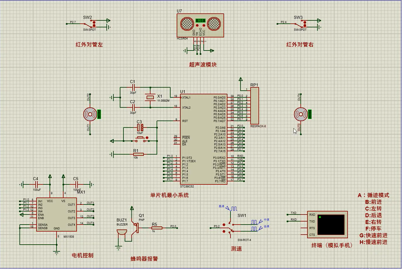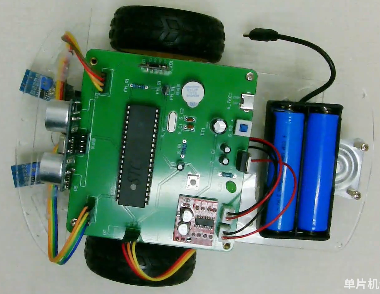 1、通过一对红外寻迹管进行寻迹,在寻迹过程中,通过超声波检测前方障碍物,当检测到障碍物距离小于50cm大于30cm,蜂鸣器报警,当检测到障碍物距离小于等于30cm时,自动停车,直到障碍物移除