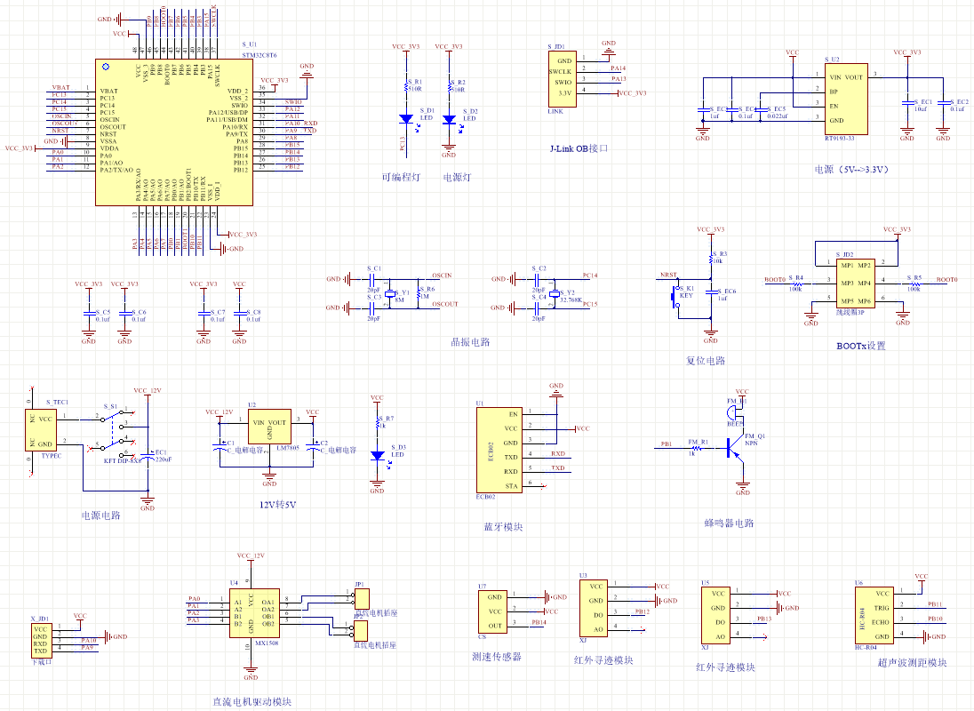 1、通过一对红外寻迹管进行寻迹,在寻迹过程中,通过超声波检测前方障碍物,当检测到障碍物距离小于50cm大于30cm,蜂鸣器报警,当检测到障碍物距离小于等于30cm时,自动停车,直到障碍物移除