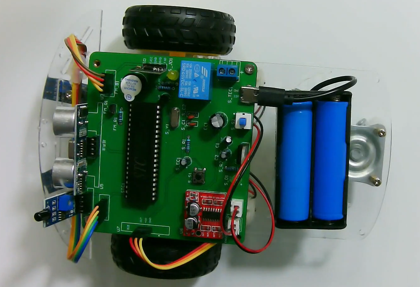 1、通过一对红外寻迹管进行寻迹,在寻迹过程中,通过超声波检测前方障碍物,当检测到障碍物距离小于50cm大于30cm,蜂鸣器报警,当检测到障碍物距离小于等于30cm时,自动停车,直到障碍物移除