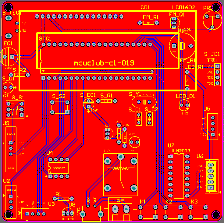 注意:PCB图中间有一个项目编号,隐藏在单片机底座下,插入单片机后不会看到。如果想截没有项目编号的PCB图,可在PCB源文件中点击删除。另外,如果想在实物PCB板上加自己的信息(比如日期、学号、姓名等),可联系客服。