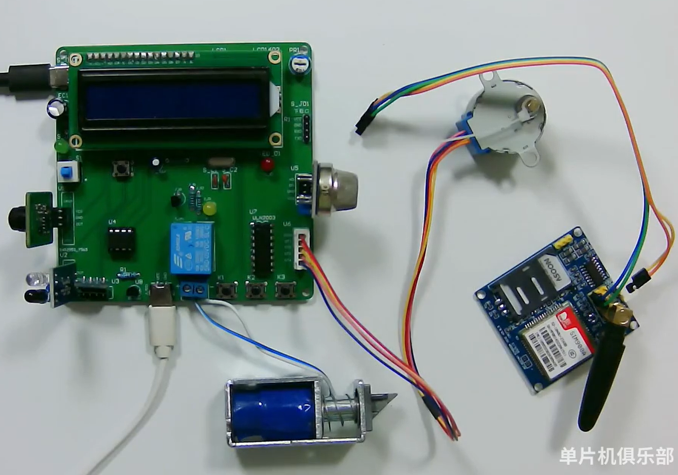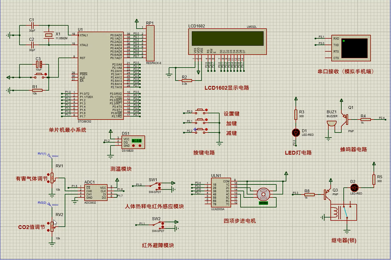 5、通过人体热释电检测车内是否有人,如果有人,当温度超过上下限、CO2浓度或有害气体浓度超过上限值,则声光报警,温度大于上限值、CO2浓度或有害气体浓度超过上限值打开车窗(通过步进电机模拟),并通过GSM发送短信“车内有人,请速速查看”