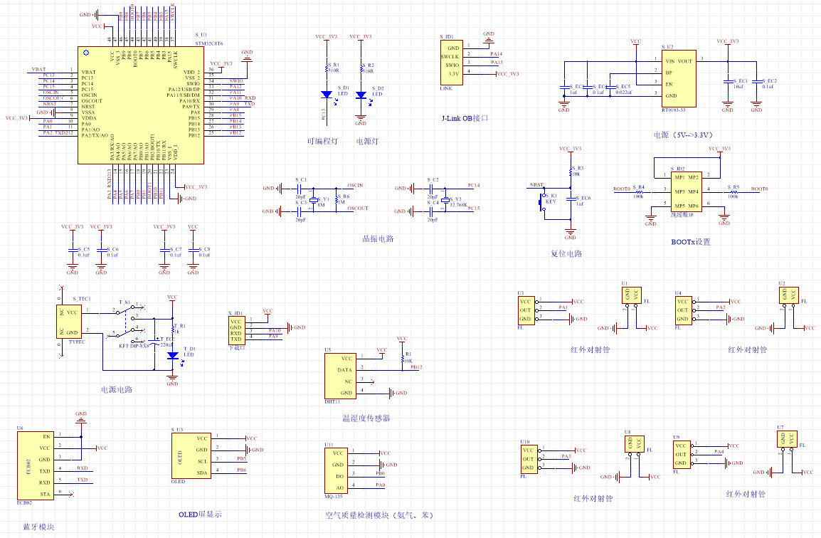 PCB图是由原理图导出,封装很大一部分都是作者自己绘制,不提供封装库,只提供连接好的源文件,可以直接在嘉立创进行打板。两层板,上下覆铜接地。