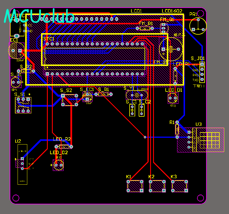 注意:PCB图中间有一个项目编号,隐藏在单片机底座下,插入单片机后不会看到。如果想截没有项目编号的PCB图,可在PCB源文件中点击删除。另外,如果想在实物PCB板上加自己的信息(比如日期、学号、姓名等),可联系客服。