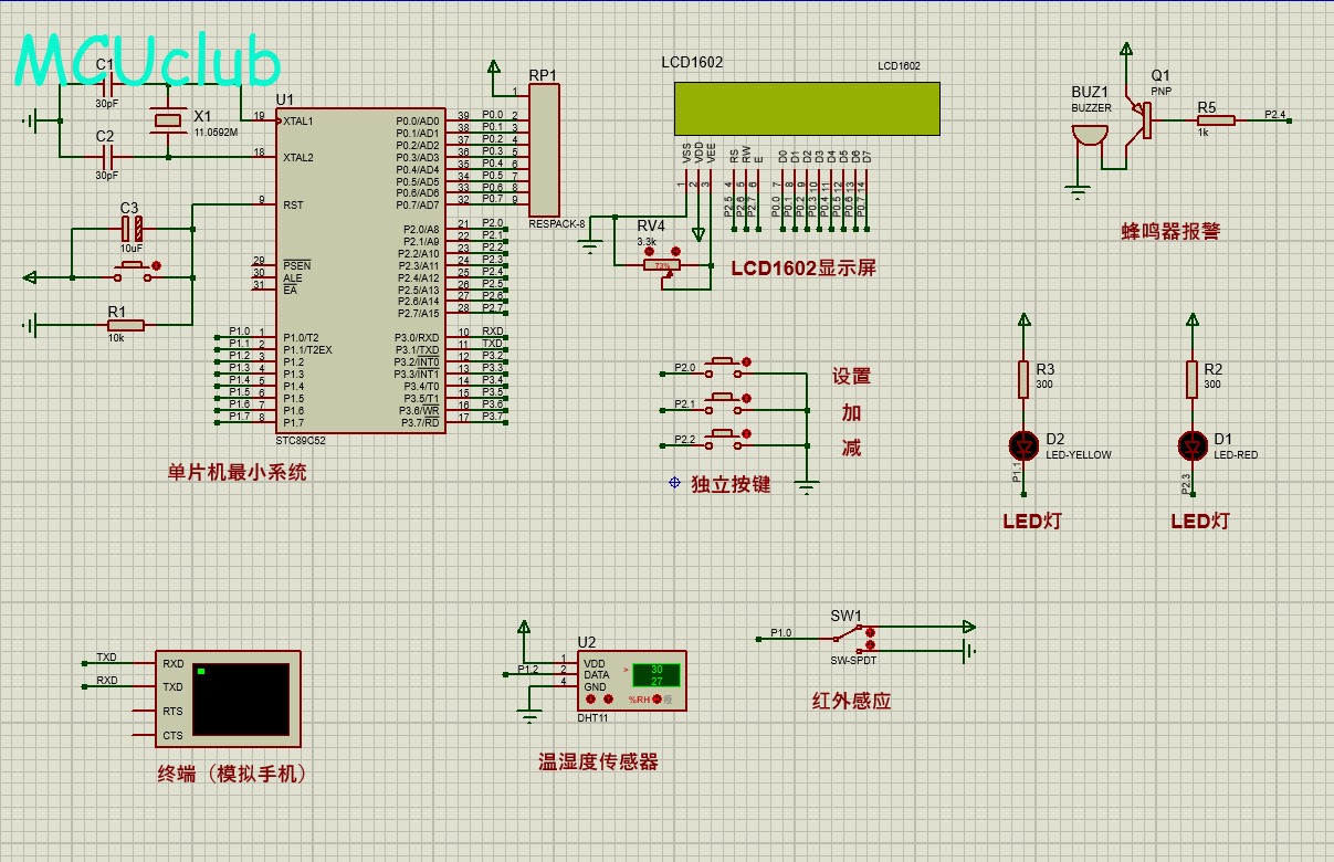 1、通过DHT11检测温湿度值,当温湿度超过设置的上下限阈值时,红灯闪烁,蜂鸣器间断报警,可通过按键提前取消