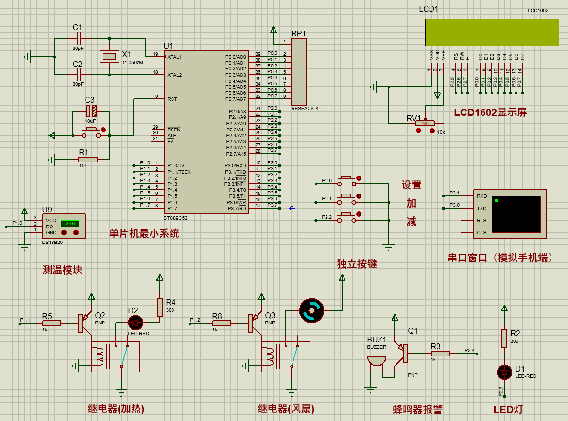 关键词:STC89C52单片机;温度采集;加热片;报警;制冷片