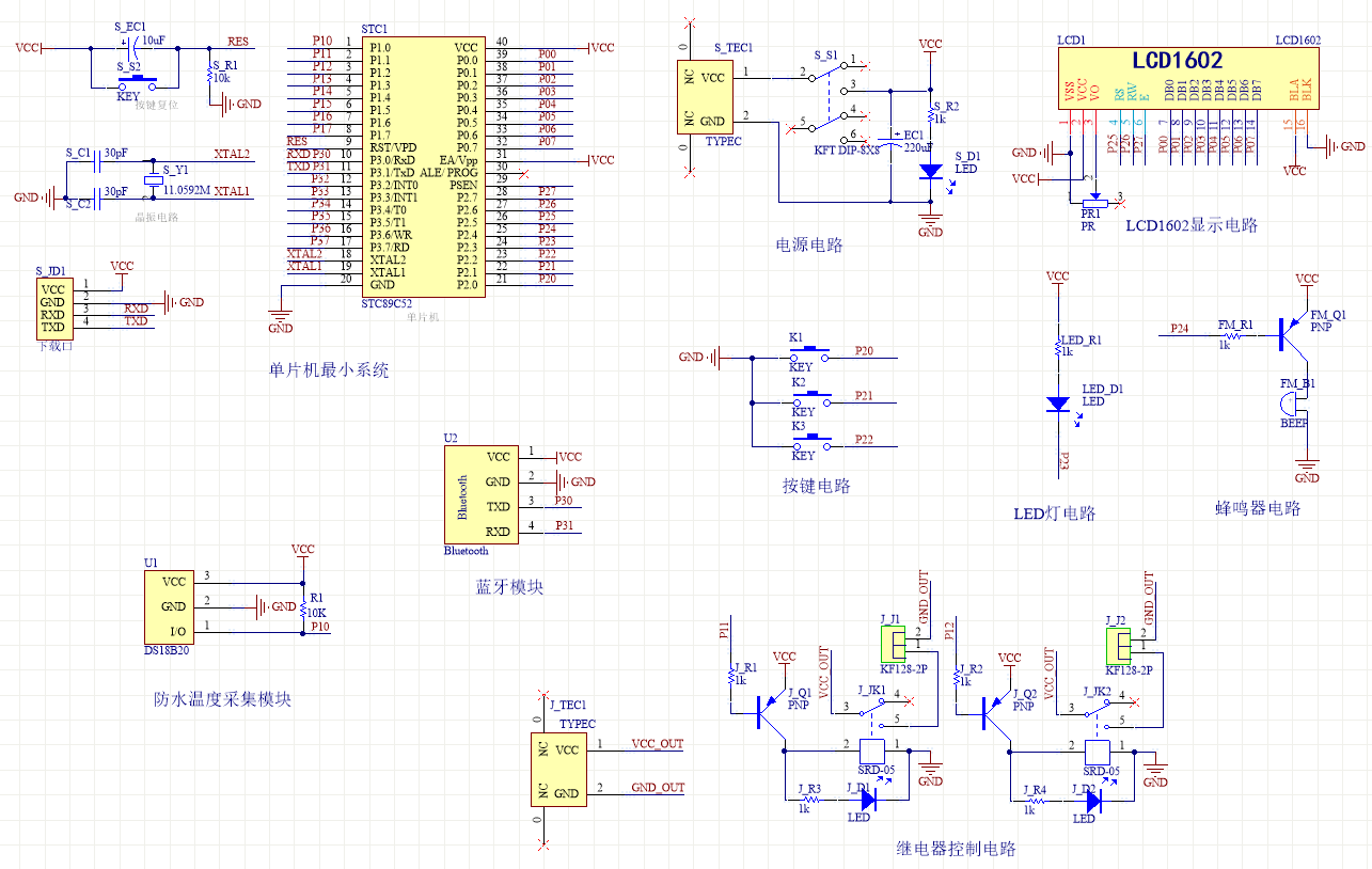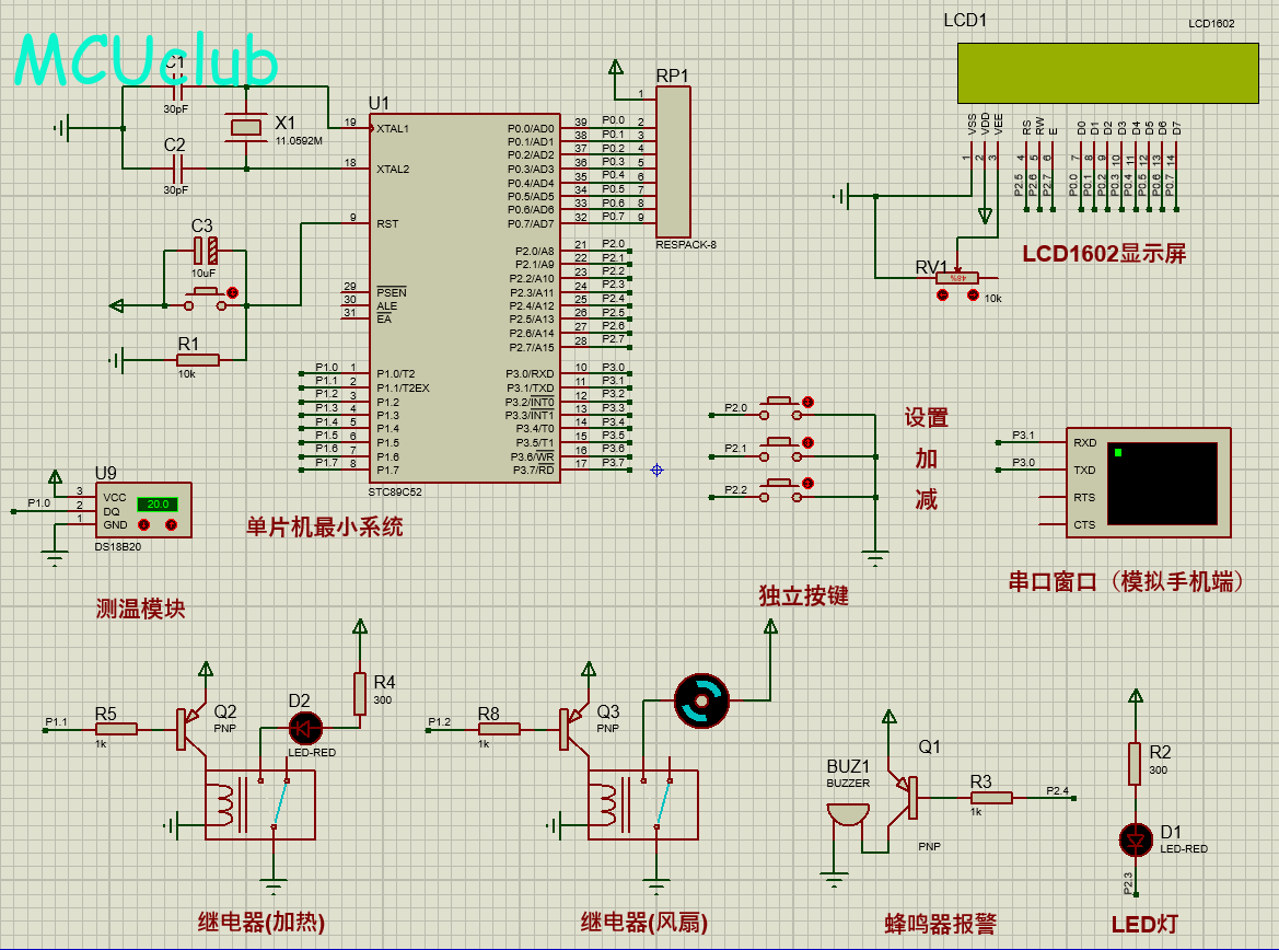 1、通过防水式DS18B20测量水温,当温度不在设定的上下限值之内时,进行相应的加热(防水加热棒)或制冷(风扇),并进行声光报警