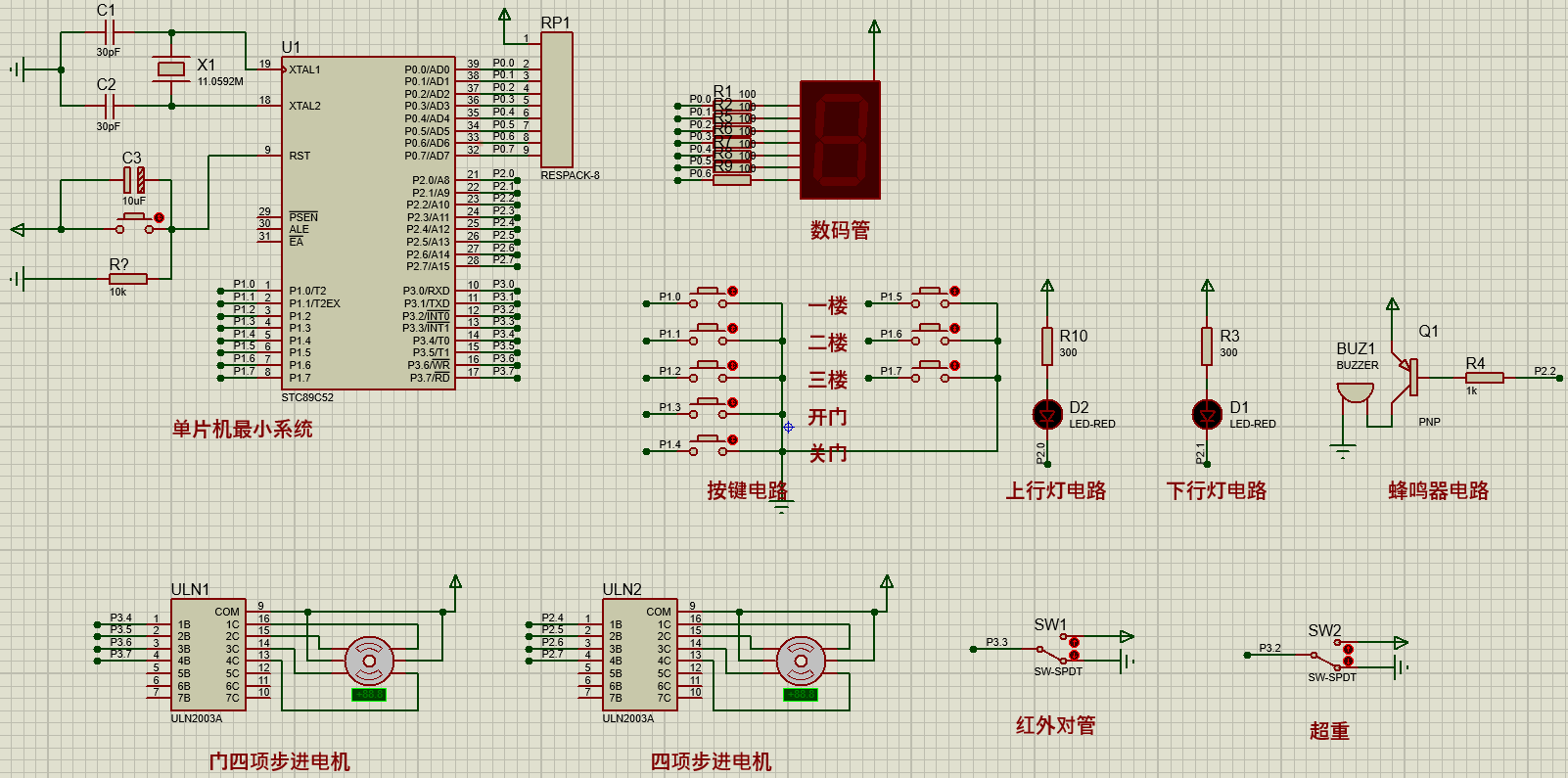 高层建筑成为城市建设的一大标志。为了方便人们的出行和工作,高层建筑设计引入了楼字自动化和智能化的科技,电梯成为高层途筑必备的运行工具。所以加强和完善电梯外观及自动化控制系统的设计成为当下高层建筑规划中的一个重要任务。此次设计一款三层电梯,通过软件和硬件配合使,使其具有检测电梯内当前乘坐电梯重的体重,当电梯内超重时进行声光报警提醒,防止重量过大使得电梯损坏,使用数码管显示当前所在楼层,到达对应楼层指示灯点亮,并实时显示电梯上下运行。为了防止电梯在关门时夹道用户,采用红外对管检测是否有人,检测到有人时,电梯门不能关闭,防止用户被电梯门加到。