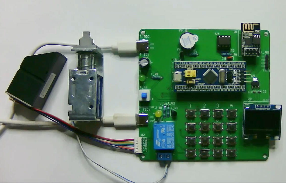 1、通过4*4的矩阵键盘中的0-9为数字键,*为删除键,#为确定键,A为重置密码键,B为一键还原密码键,C为添加指纹,D为删除指纹
