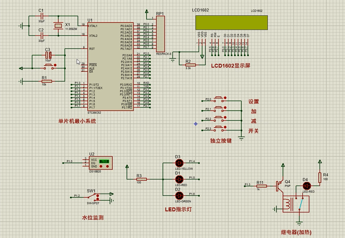 2、通过防水式DS18B20检测水温,当电源打开时,温度小于设置最小值,进行自动加热,直到加热到最大值时停止;