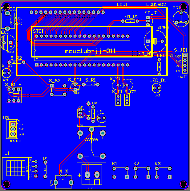 注意:PCB图中间有一个项目编号,隐藏在单片机底座下,插入单片机后不会看到。如果想截没有项目编号的PCB图,可在PCB源文件中点击删除。另外,如果想在实物PCB板上加自己的信息(比如日期、学号、姓名等),可联系客服。