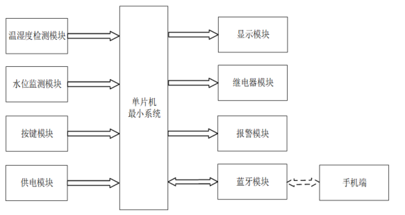 2、通过液位检测模块检测加湿器中是否还有水,如果没有,则自动停止加湿、声光提醒