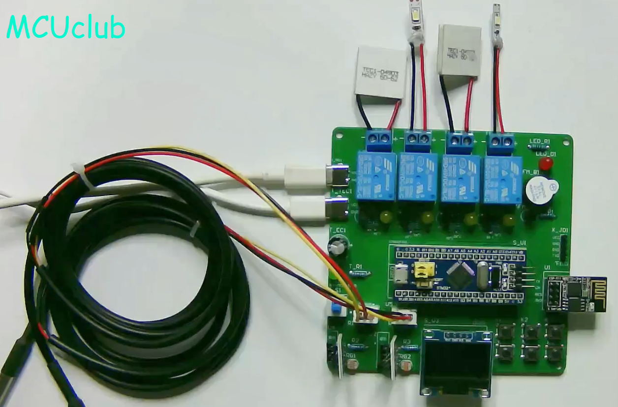 1、通过两个防水式DS18B20测量冰箱的上下层温度,并通过两个继电器模拟上下层制冷系统,当温度高于设置最大值时,相应层的继电器闭合进行制冷,直到小于设置最小值
