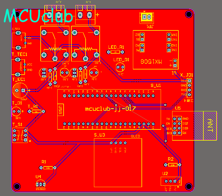PCB图是由原理图导出,封装很大一部分都是作者自己绘制,不提供封装库,只提供连接好的源文件,可以直接在嘉立创进行打板。两层板,上下覆铜接地。