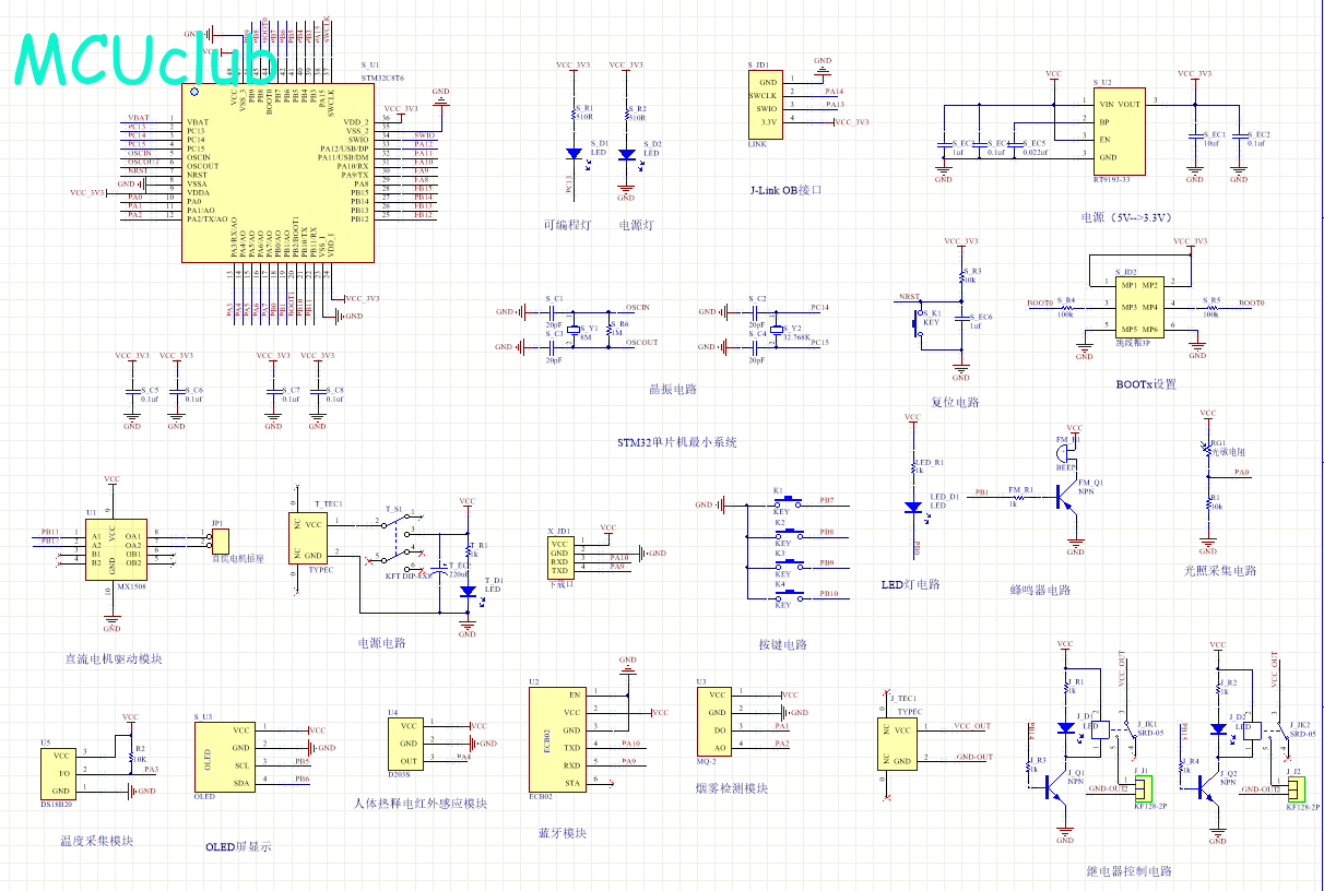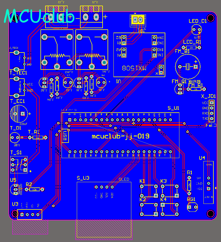 PCB图是由原理图导出,封装很大一部分都是作者自己绘制,不提供封装库,只提供连接好的源文件,可以直接在嘉立创进行打板。两层板,上下覆铜接地。