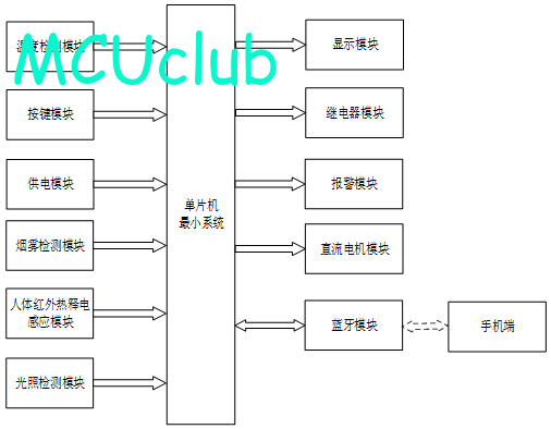 1、通过MQ-2烟雾传感器检测厨房内烟雾浓度,若烟雾浓度小于设定最小阈值,油烟机风扇不工作;若烟雾浓度在设定上下限阈值之间,风扇低速转动;若烟雾浓度在大于设定最大阈值,风扇高速转动