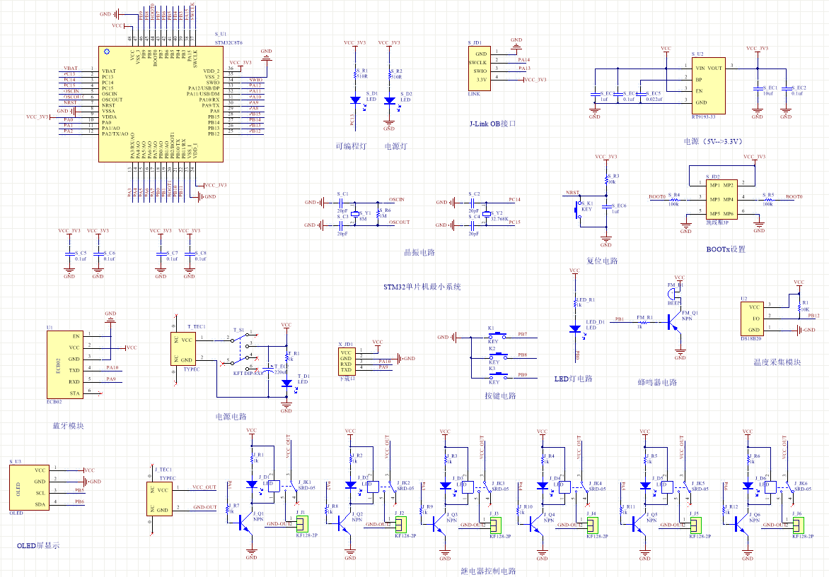 PCB图是由原理图导出,封装很大一部分都是作者自己绘制,不提供封装库,只提供连接好的源文件,可以直接在嘉立创进行打板。两层板,上下覆铜接地。