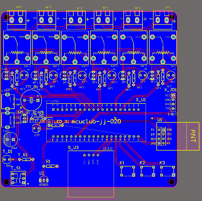 底板:底板在嘉立创进行打板,为绿色PCB板,两层板,厚度1.2,上下覆铜接地。元器件基本上为插针式,个别降压芯片会使用贴片式。