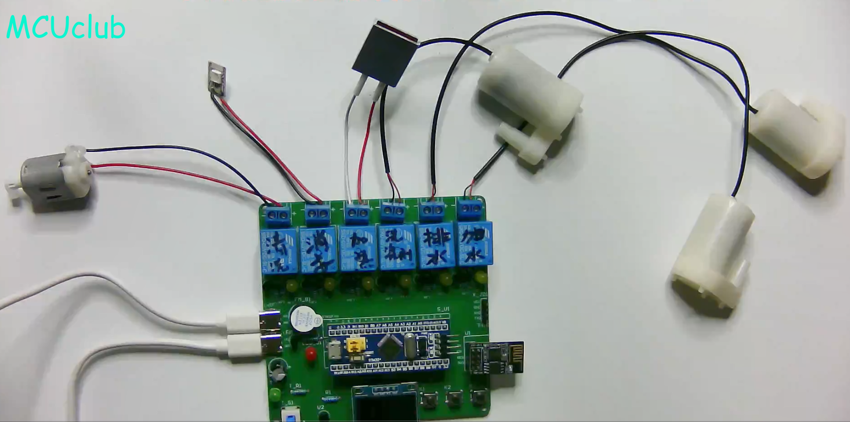 1、清洗过程:加水(5s)——加洗涤剂(3s)——加热(3s)——清洗(10s)——排水(5s)——加水(5s)——清洗(10s)——排水(5s)——加热烘干(3s)——消毒(3s)(6个继电器模拟)