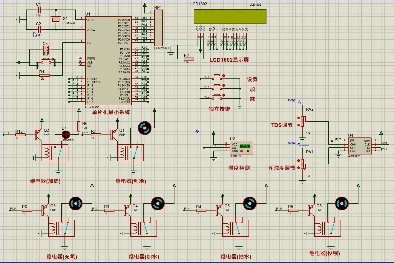 1、通过TDS水质模块检测水质,当水质数值大于设置最大值,进行自动换水(两个水泵)