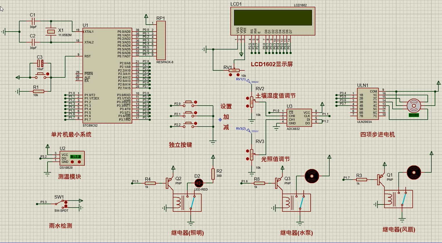 3、通过光敏电阻检测光照值,当光照值小于设置最小值时则自动进行补光;当光照值大于设置最大值时,则自动打开遮雨棚进行遮光(四相步进电机模拟)
