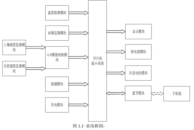 2、通过土壤湿度传感器检测湿度值,当湿度值低于设置最小值时,进行水泵浇水