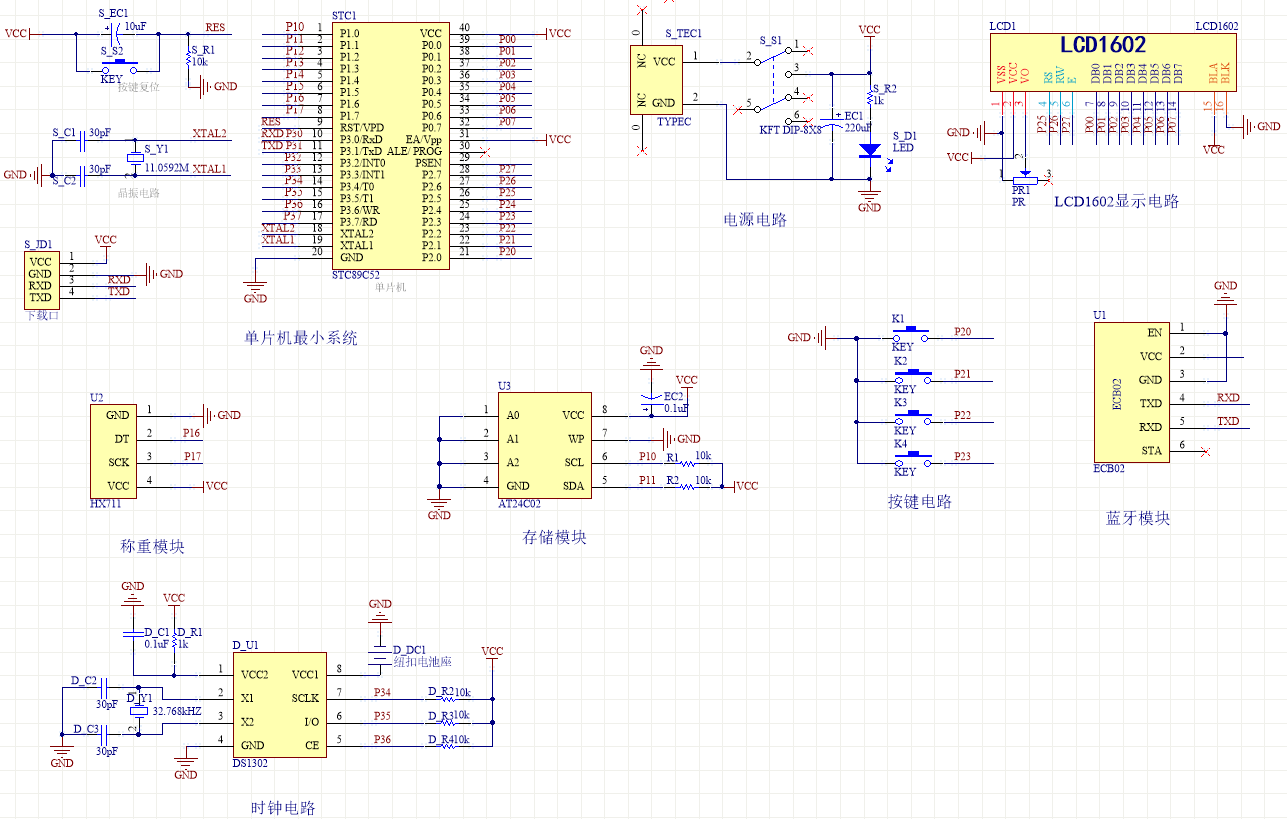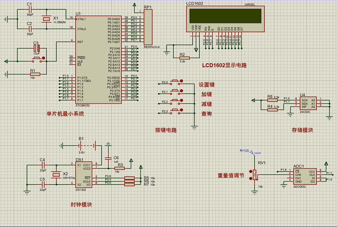 电子称主要以STC89C52单片机作为中心控制单元,通过HX711称重传感器进行重量检测,在配以键盘、显示电路及软件来组成。电子称不但计量准确、快速方便,更重要的自动称重、数字显示,对人们生活的影响越来越大,广受欢送。本系统的设计主要从硬件电路设计,软件编程调试,实物焊接调试等部分进行详细阐述。硬件电路主要是基于单片机STC89C52为核心的控制单元实现数据的处理,通过HX711压力传感器对数据进行采集,通过DS1302获取时间,AT24C02存储器用于存储时间和重量数据,然后将采集到的数据送到主控单片机进行处理显示,数据显示由LCD1602液晶实现,液晶显示效果稳定无闪烁。