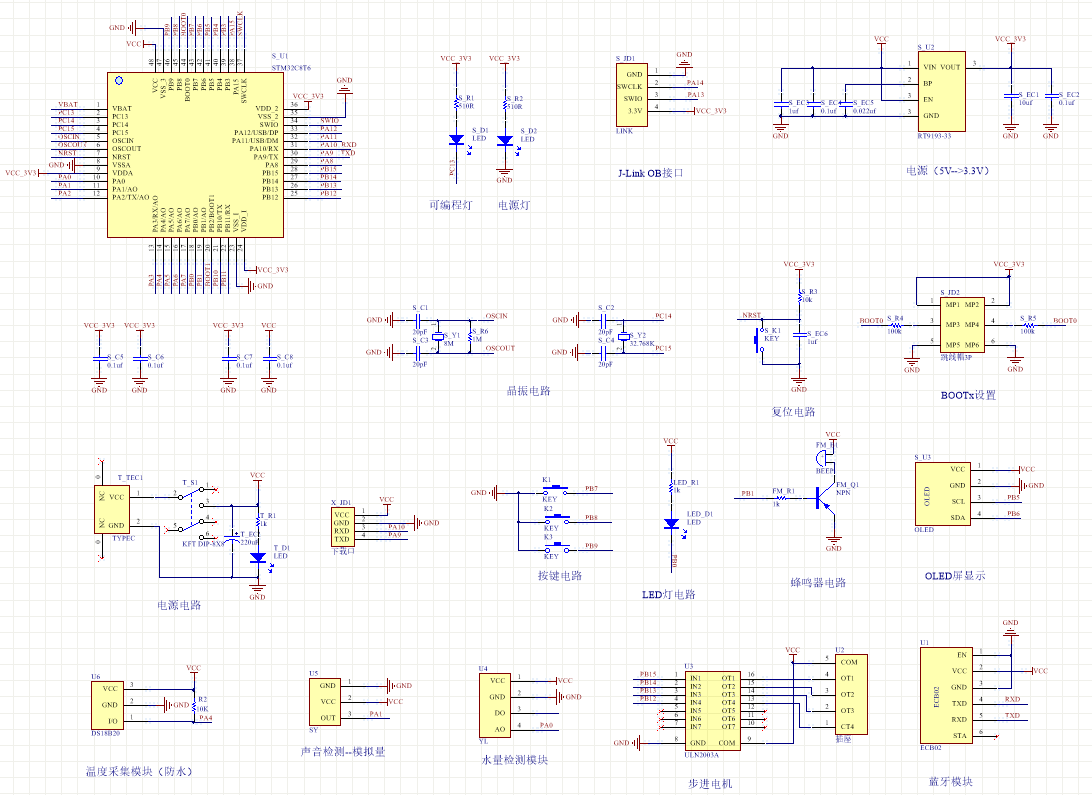 PCB图是由原理图导出,封装很大一部分都是作者自己绘制,不提供封装库,只提供连接好的源文件,可以直接在嘉立创进行打板。两层板,上下覆铜接地。