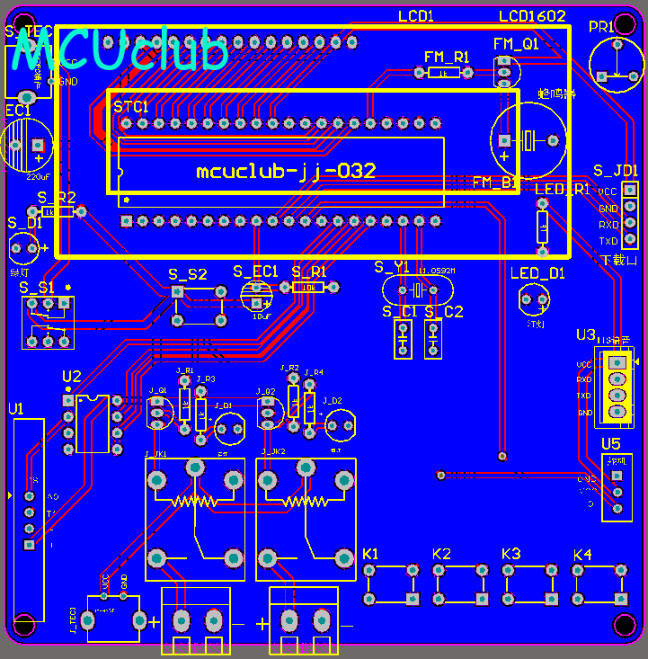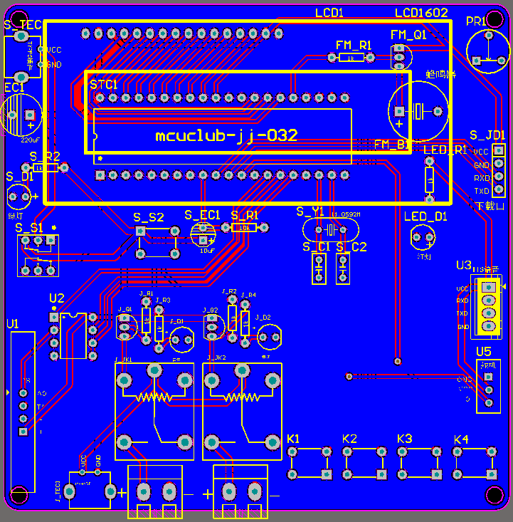 注意:PCB图中间有一个项目编号,隐藏在单片机底座下,插入单片机后不会看到。如果想截没有项目编号的PCB图,可在PCB源文件中点击删除。另外,如果想在实物PCB板上加自己的信息(比如日期、学号、姓名等),可联系客服。