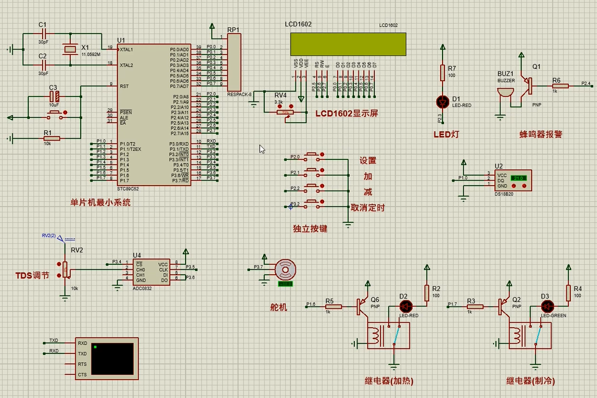 1、通过DS18B20测得水杯中水温,当温度高于最大值或低于最小值,则进行制冷或加热
