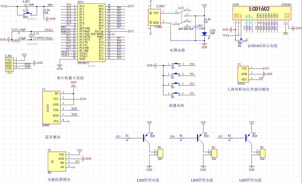 当前大多数用户的家庭之中,其灯控还是通过按键对其进行开关控制,当用户出门忘记关灯时,导致家中照明系统一定电亮导致电能的浪费,因此设计一款智能灯控,该系统通过3个LED灯模拟三个房间的灯(客厅、卧室、洗手间);通过3个按键,可以控制这三个灯的亮灭;通过人体热释电检测当前是否有人,检测到有人且光照强度小于设置的最小值控制照明灯打开,并可以根据当前的光照强度进行自动调节。通过该设计当检测到室内无人或者光照强度大于设置的最大值时,照明灯不点亮,可以节省大量的资源浪费。