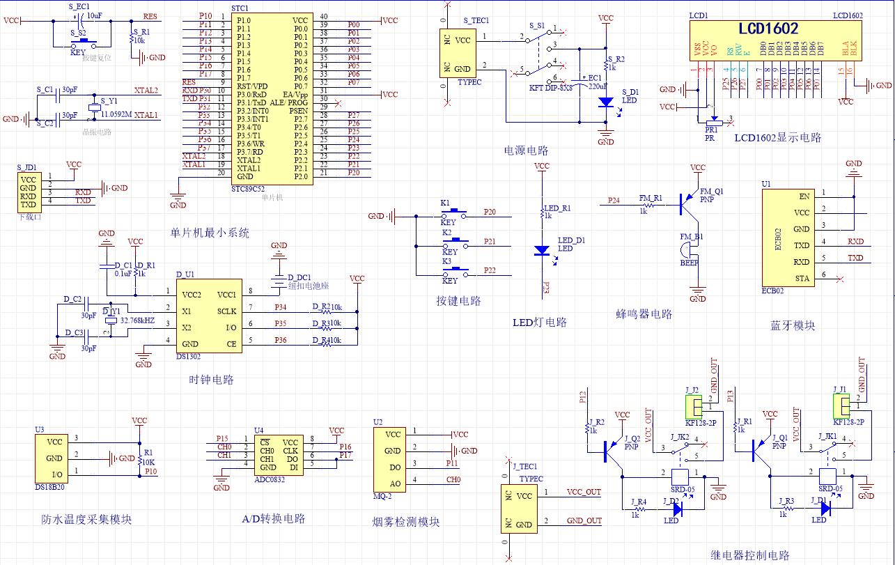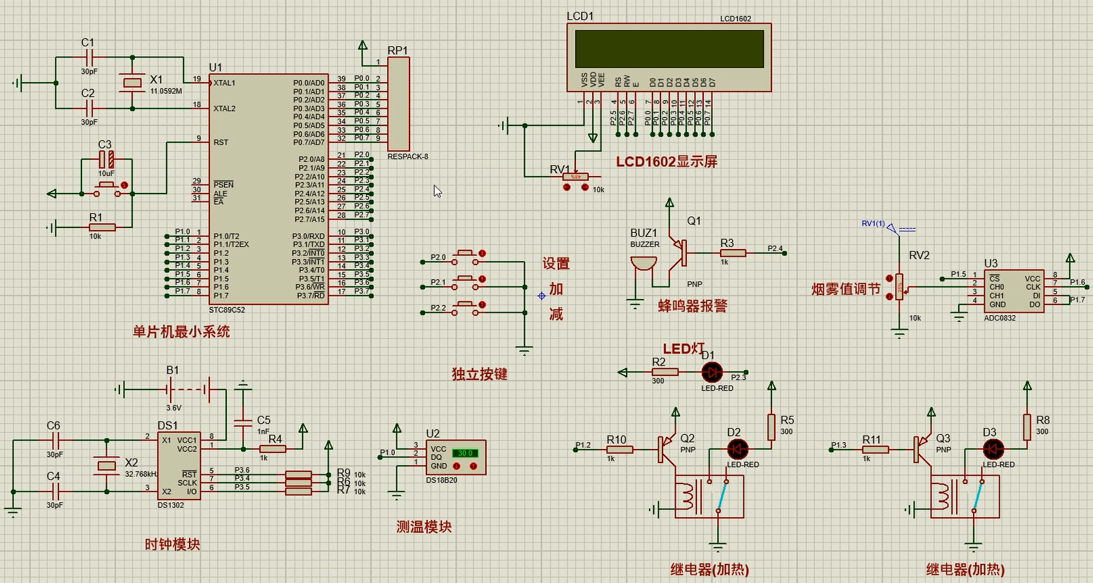 1、通过DS1302同步时间,可设定自动开电热毯时间,可通过按键关闭电热毯