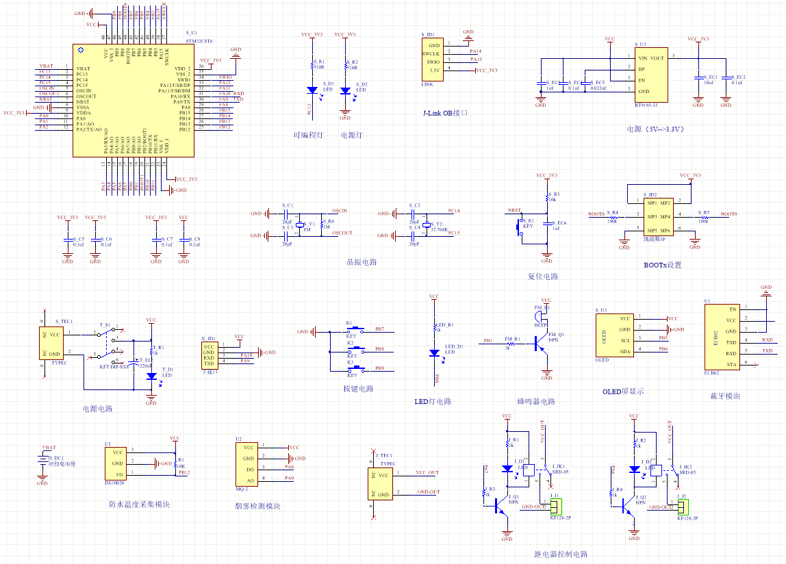 PCB图是由原理图导出,封装很大一部分都是作者自己绘制,不提供封装库,只提供连接好的源文件,可以直接在嘉立创进行打板。两层板,上下覆铜接地。