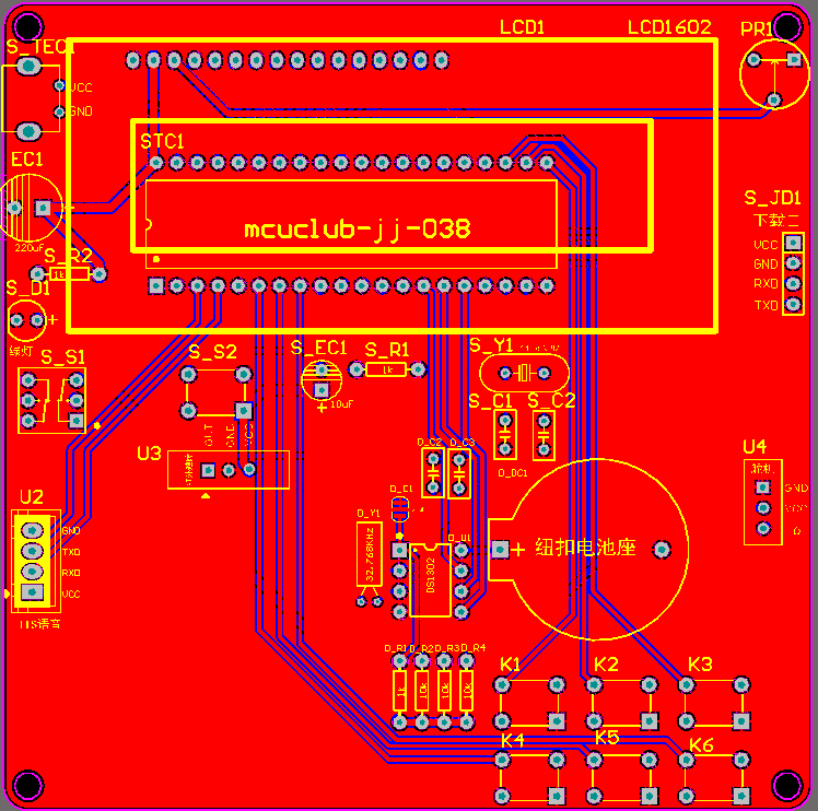 注意:PCB图中间有一个项目编号,隐藏在单片机底座下,插入单片机后不会看到。如果想截没有项目编号的PCB图,可在PCB源文件中点击删除。另外,如果想在实物PCB板上加自己的信息(比如日期、学号、姓名等),可联系客服。