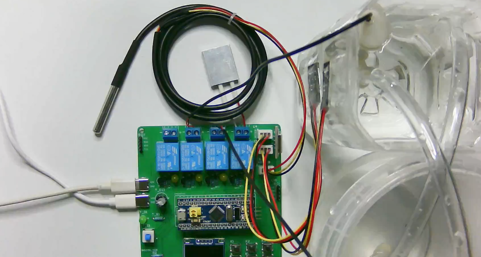 1、 通过防水式DS18B20采集水温,当水温小于设置最小值,则进行加热,直到加到最大值