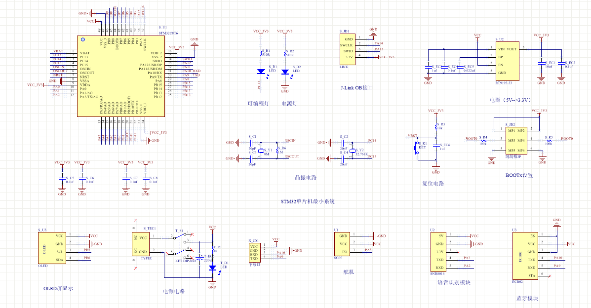 关键字:STM32F103C8T6;语音识别;蓝牙控制;定时控制;舵机控制