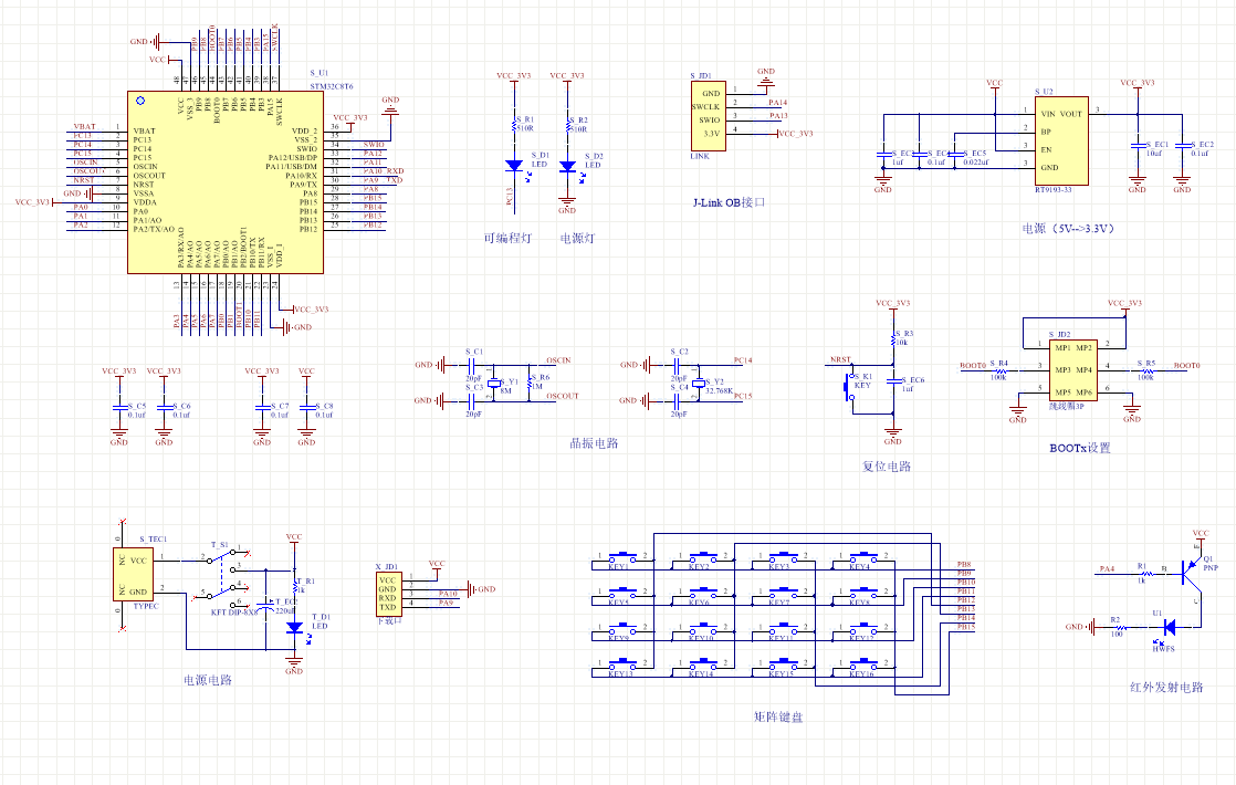 PCB图是由原理图导出,封装很大一部分都是作者自己绘制,不提供封装库,只提供连接好的源文件,可以直接在嘉立创进行打板。两层板,上下覆铜接地。