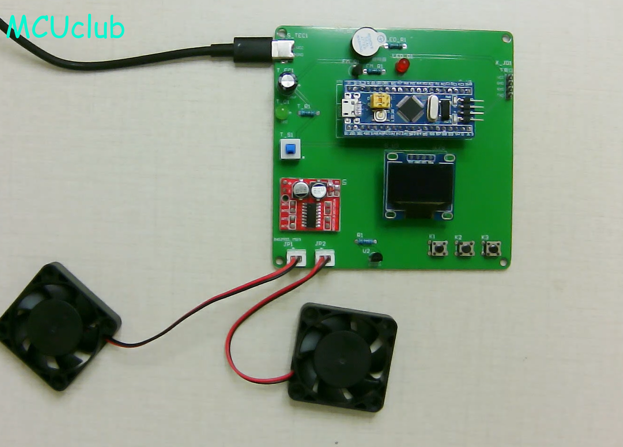 1、通过DS18B20检测温度值,当温度大于设置最小值,启动两个风扇低速转动,当温度大于设置最大值,启动两个风扇高速转动,当温度大于设置危险温度,进行声光报警