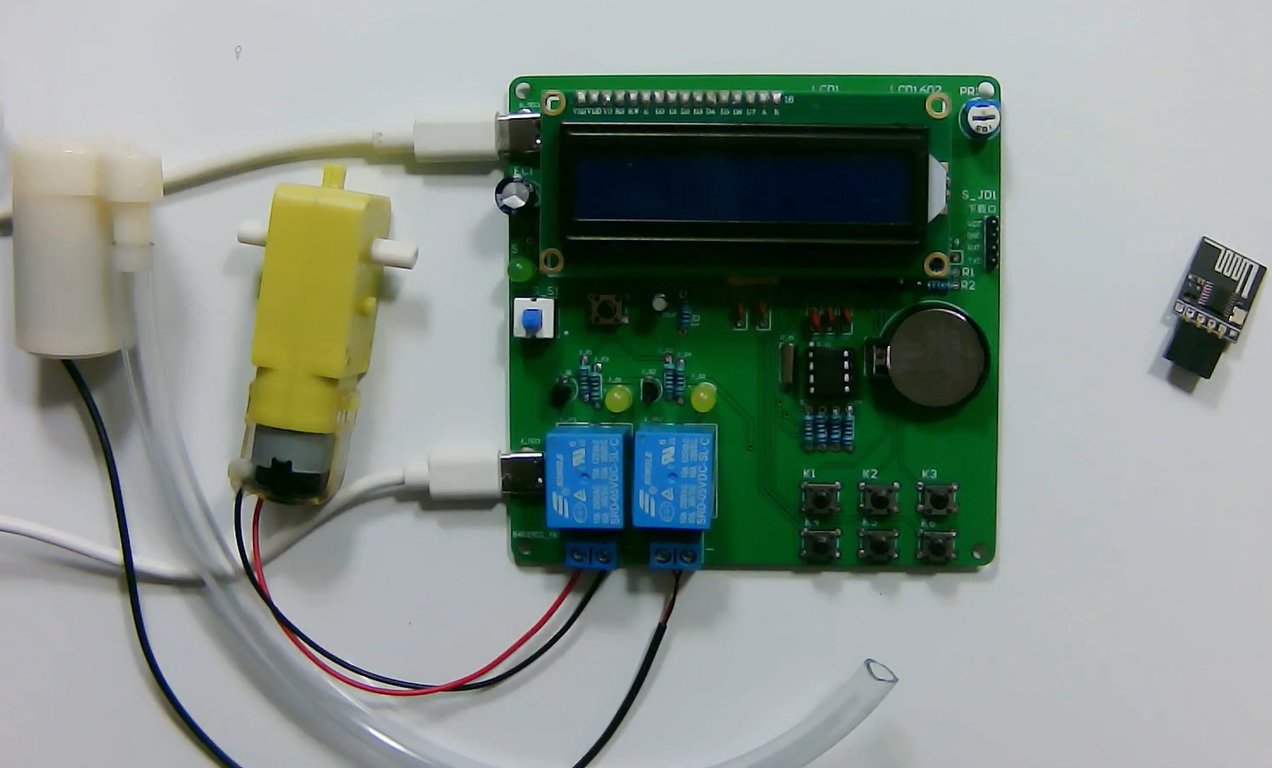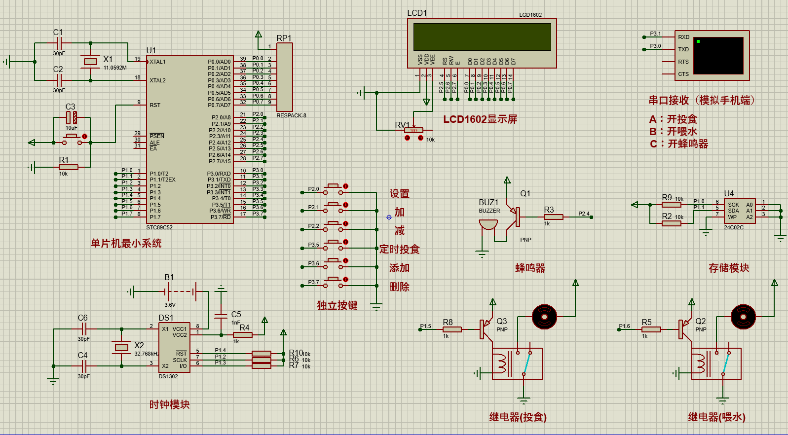 4、当投喂时间到达时,蜂鸣器报警提醒(2s),并开启两个继电器(喂食、喂水)