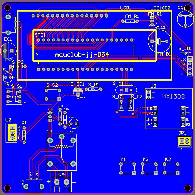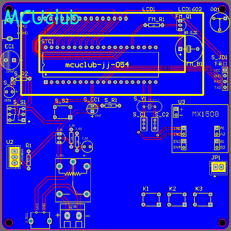 注意:PCB图中间有一个项目编号,隐藏在单片机底座下,插入单片机后不会看到。如果想截没有项目编号的PCB图,可在PCB源文件中点击删除。另外,如果想在实物PCB板上加自己的信息(比如日期、学号、姓名等),可联系客服。