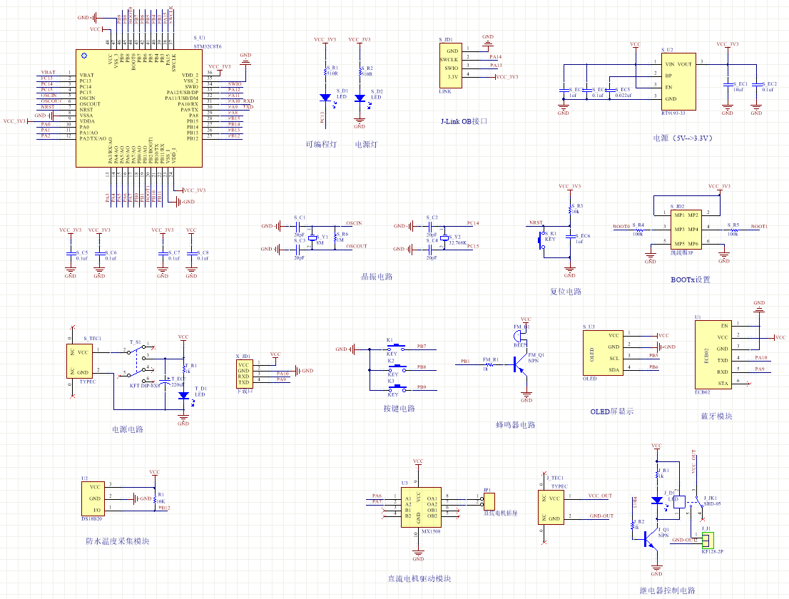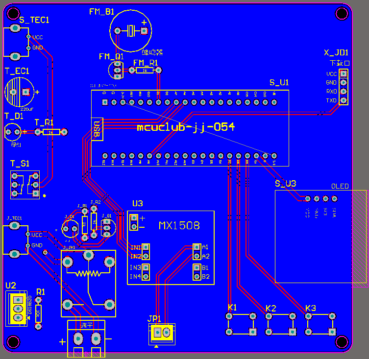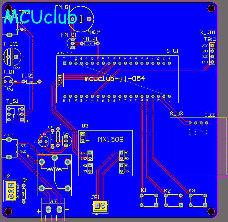 PCB图是由原理图导出,封装很大一部分都是作者自己绘制,不提供封装库,只提供连接好的源文件,可以直接在嘉立创进行打板。两层板,上下覆铜接地。