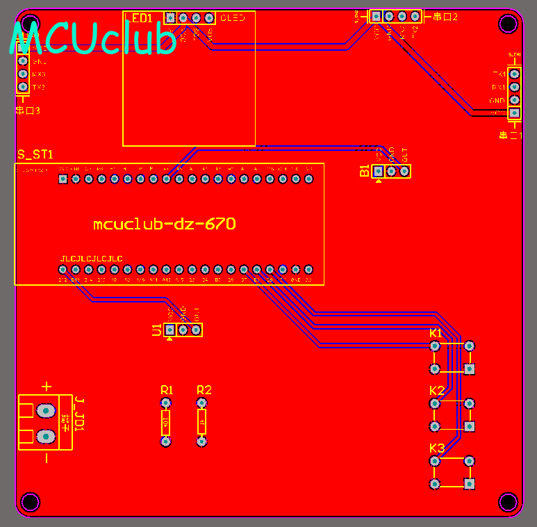 注意:PCB图中间有一个项目编号,隐藏在单片机底座下,插入单片机后不会看到。如果想截没有项目编号的PCB图,可在PCB源文件中点击删除。另外,如果想在实物PCB板上加自己的信息(比如日期、学号、姓名等),可联系客服。