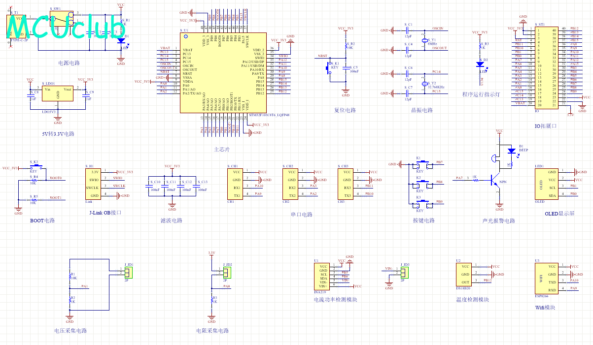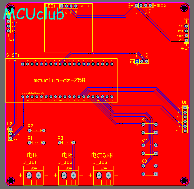 PCB图是由原理图导出,封装很大一部分都是作者自己绘制,不提供封装库,只提供连接好的源文件,可以直接在嘉立创进行打板。两层板,上下覆铜接地。