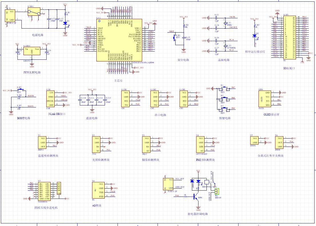 PCB图是由原理图导出,封装很大一部分都是作者自己绘制,不提供封装库,只提供连接好的源文件,可以直接在嘉立创进行打板。两层板,上下覆铜接地。