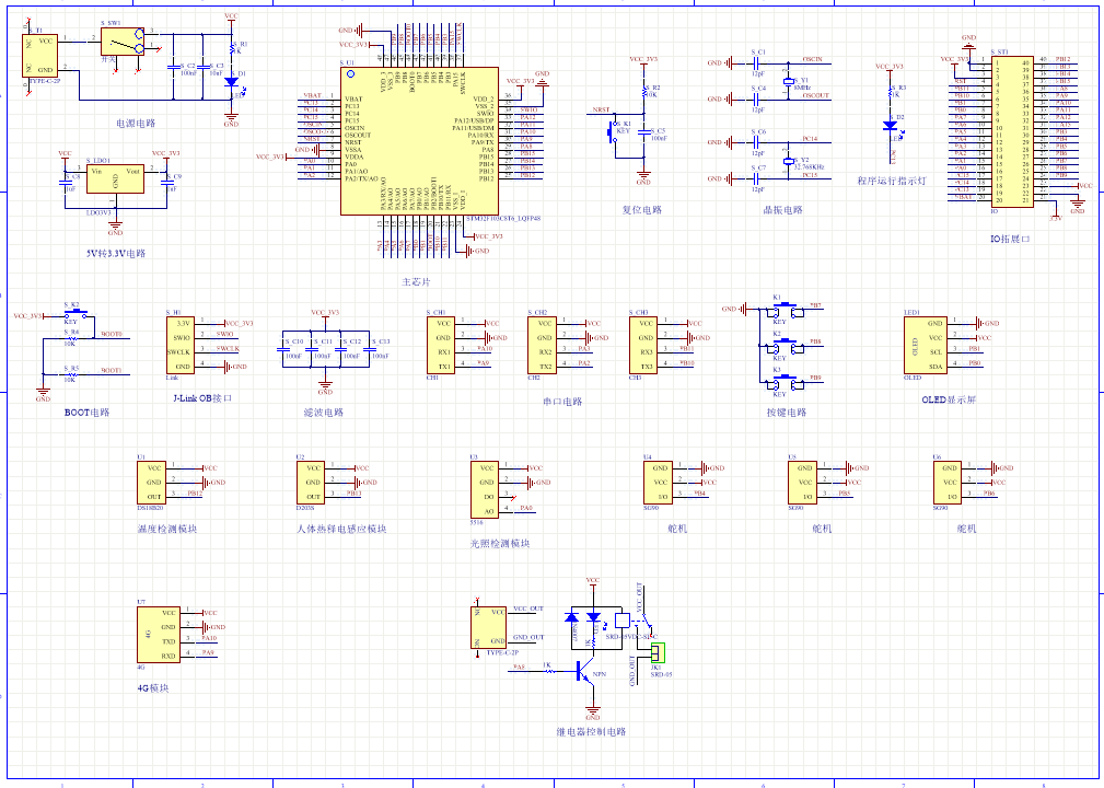 PCB图是由原理图导出,封装很大一部分都是作者自己绘制,不提供封装库,只提供连接好的源文件,可以直接在嘉立创进行打板。两层板,上下覆铜接地。