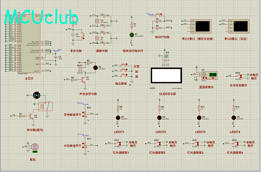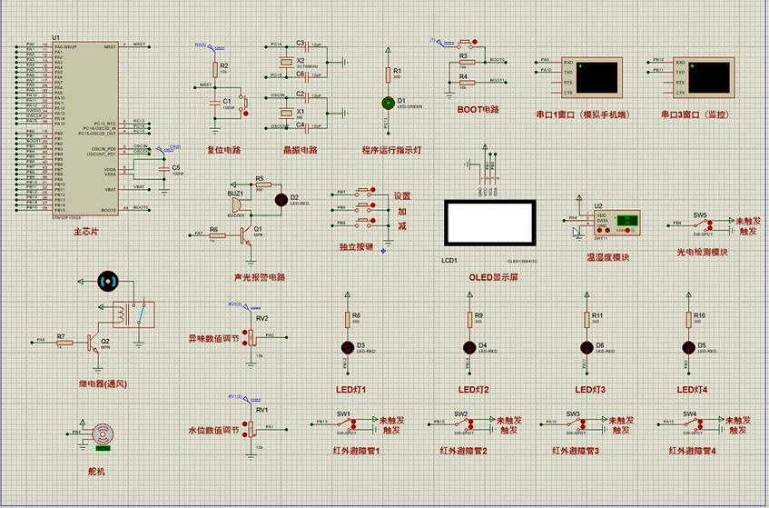 注意:部分实物元器件仿真中没有,仿真中会用其他工作原理相似的元件代替,这样可能导致实物程序和仿真程序不一样