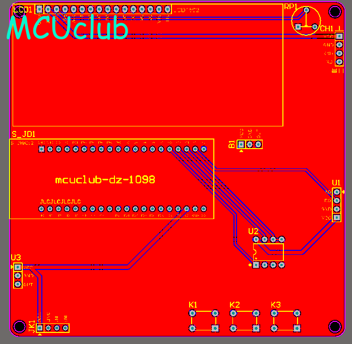注意:PCB图中间有一个项目编号,隐藏在单片机底座下,插入单片机后不会看到。如果想截没有项目编号的PCB图,可在PCB源文件中点击删除。另外,如果想在实物PCB板上加自己的信息(比如日期、学号、姓名等),可联系客服。