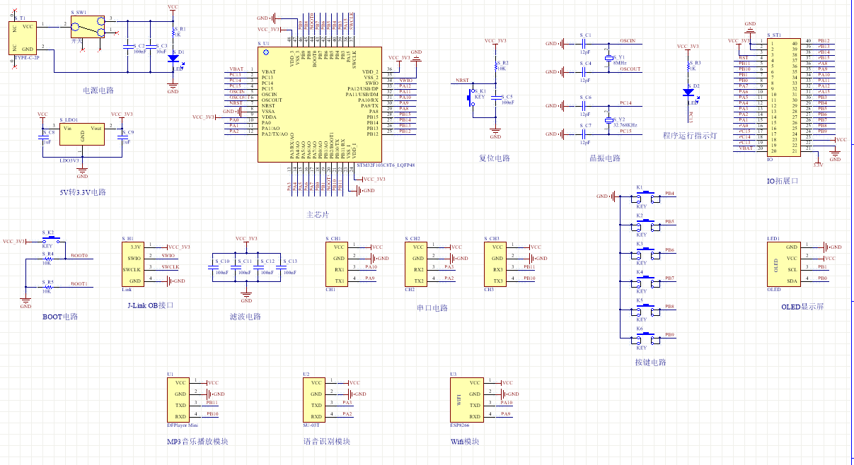 PCB图是由原理图导出,封装很大一部分都是作者自己绘制,不提供封装库,只提供连接好的源文件,可以直接在嘉立创进行打板。两层板,上下覆铜接地。