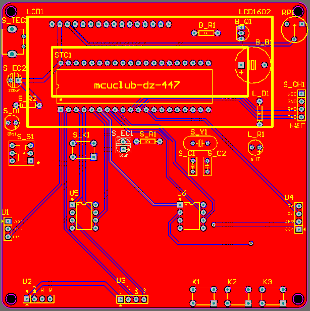 注意:PCB图中间有一个项目编号,隐藏在单片机底座下,插入单片机后不会看到。如果想截没有项目编号的PCB图,可在PCB源文件中点击删除。另外,如果想在实物PCB板上加自己的信息(比如日期、学号、姓名等),可联系客服。