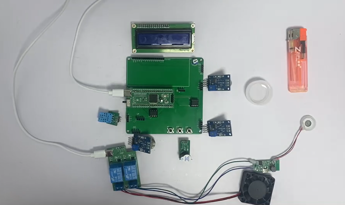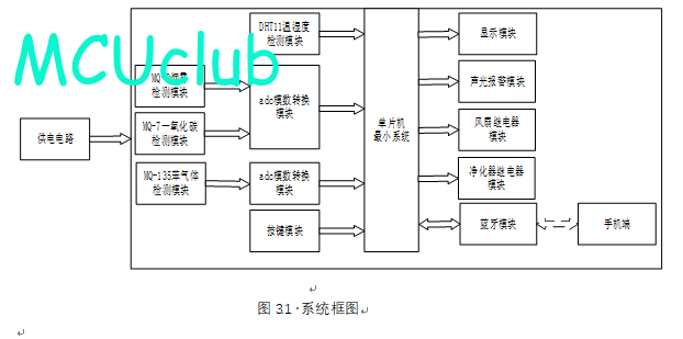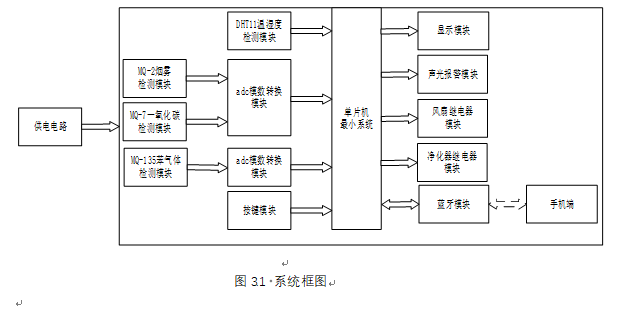 2、通过MQ-2模块检测烟雾值,当烟雾值大于设置最大值时开启风扇和净化器,同时进行声光报警提醒